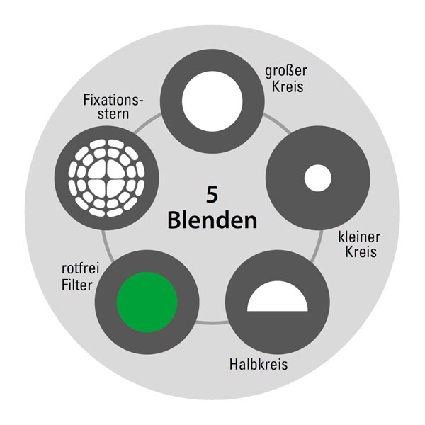 • Aperturas para todo escenario: Incluye 5 aperturas (retícula, círculo grande, círculo pequeño, semicírculo y filtro verde).